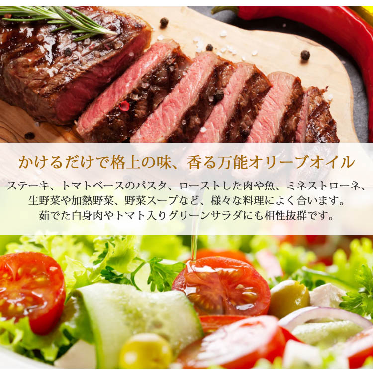 ステーキ、トマトベースのパスタ、ローストした肉や魚、ミネストローネ、生野菜や加熱野菜、野菜スープなど、様々な料理によく合います。 「茹でた白身肉やトマト入りグリーンサラダにも相性抜群です。