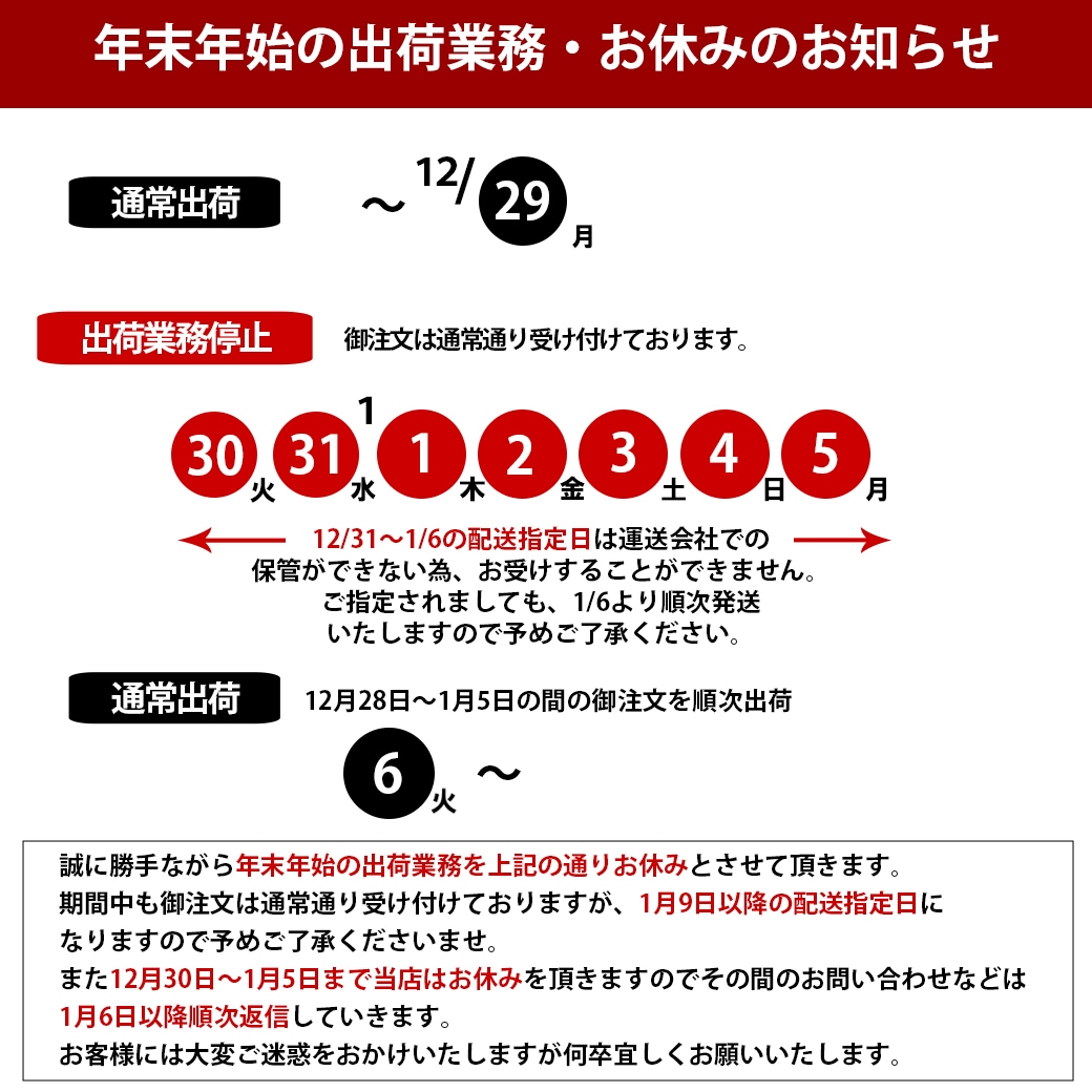 誠に勝手ながら年末年始の出荷業務を上記の通りお休みとさせて頂きます。